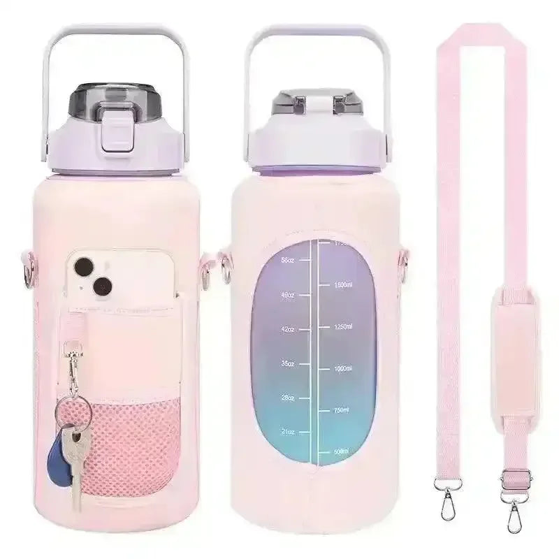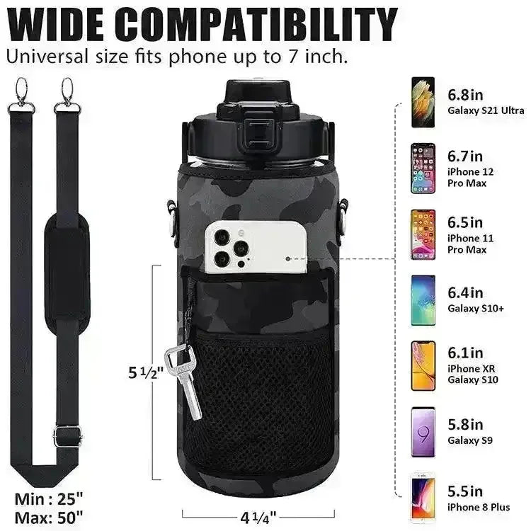 🌟 Material: Crafted from BPA-free Tritan plastic, this water bottle ensures safe and healthy hydration for your fitness journey. 🌟 Capacity: With a large 2-liter capacity, this bottle holds plenty of water to keep you hydrated throughout the day. 🌟 Color: Featuring a stylish camo color design, this bottle adds a touch of rugged charm to your fitness gear. 🌟 Accessories: Complete with a convenient storage sleeve, carry strap, and cellphone holder, this bottle is your ultimate hydration and fitness companion.