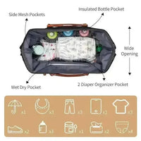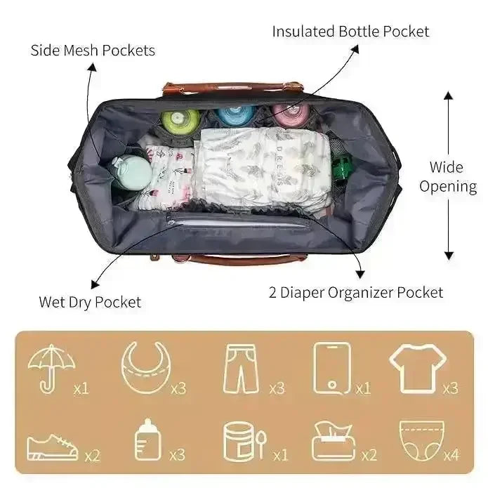 Large Capacity for Mom and Baby: With a thoughtfully designed layout, the diaper bag offers generous space for both mommy and baby essentials. It includes specialized pockets for milk bottles, wet clothes, diapers, and wipes, ensuring everything is well-organized and easily accessible.