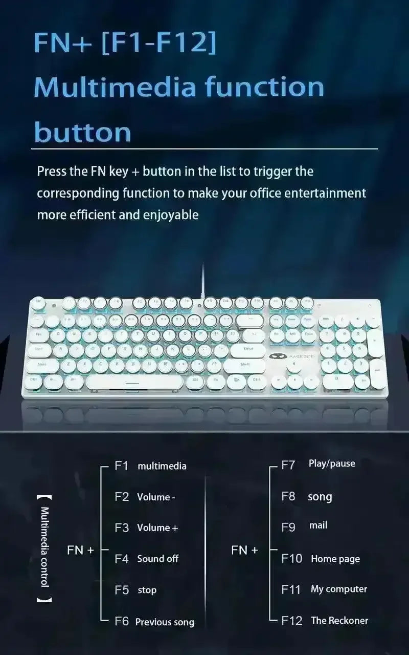 - Retro Typewriter Style Keycaps: Crafted with unique round keycaps using a two-color injection molding process, these durable keycaps provide a classic aesthetic that stands out from ordinary keyboards.