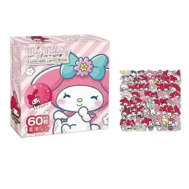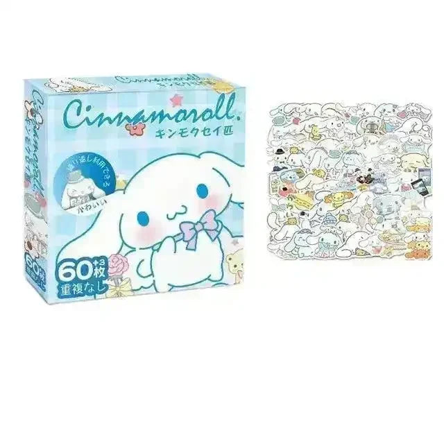 Unleash your creativity and express your love for Sanliou with this adorable collection of 60 stickers! Each box is dedicated to one of your favorite characters: Hello Kitty, Kuromi, Cinnamoroll, Pochacco, or My Melody, offering a variety of fun and colorful designs to decorate your belongings.